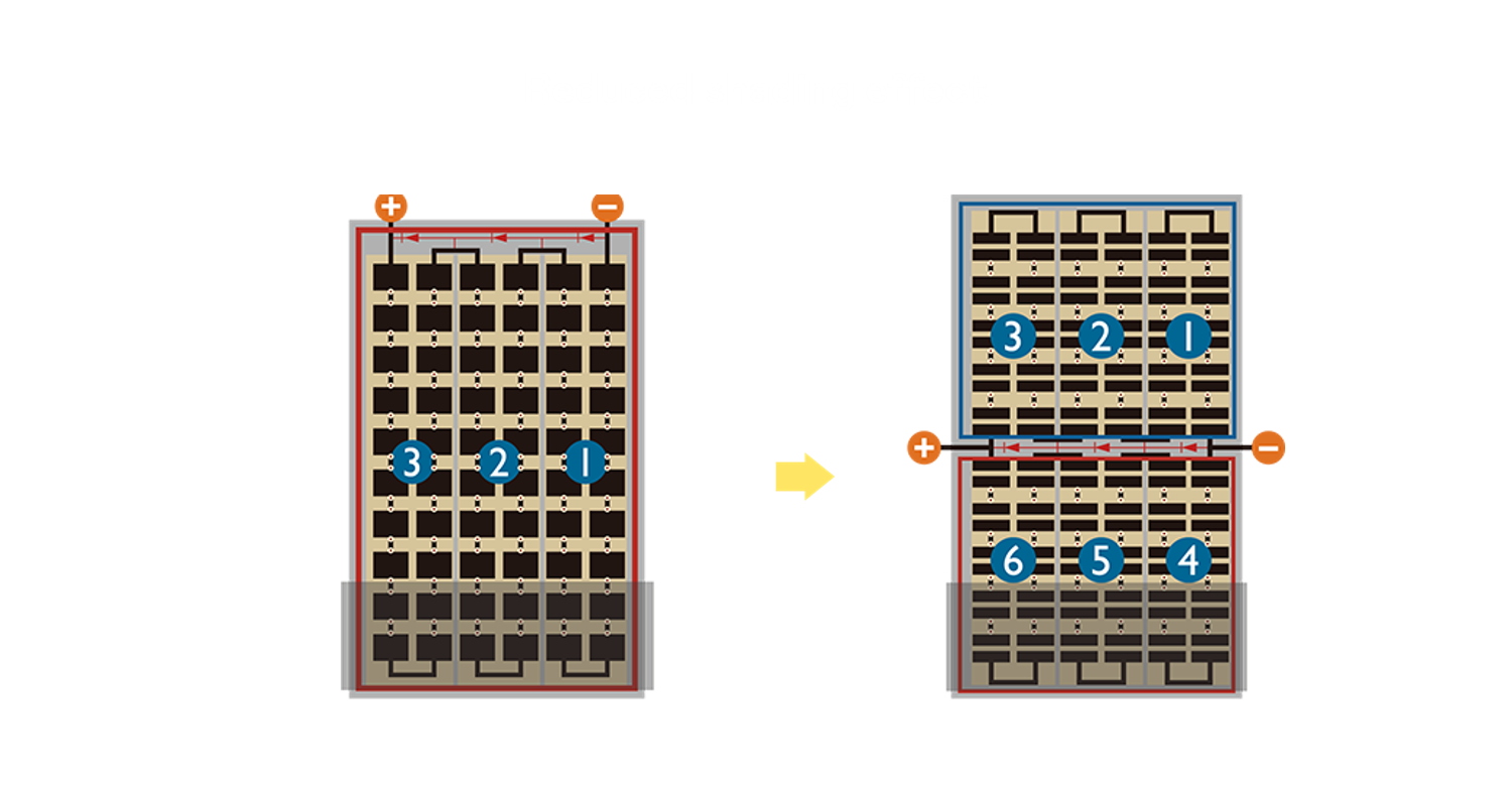 - 结合半切电池,降低遮阴影响、提升模组抗隐裂能力、并减少电阻损耗,进一步提升模组发电效能。